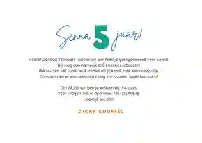 Het is soms best een opgave, bedenken wat voor kinderfeestje je wilt organiseren voor je kleine jongen of meisje. Het ene moment vinden ze het één leuk, het volgende moment iets anders. Daarom hebben we onze designers gevraagd uitnodigingen te maken voor verschillende activiteiten én in uiteenlopende stijlen. Er zit dus vast een uitnodiging tussen die je aanspreekt. Heb je een leuke uitnodiging gezien, maar is het voor een kindje van 6 jaar of 7 jaar? Controleer dan of de leeftijd van deze uitnodiging aanpasbaar is. Mocht dit niet het geval zijn, dan kun je contact opnemen met ons klanttevredenheidsteam. Onze designers gaan dan kijken of ze ‘5 jaar’ op de uitnodiging voor het kinderfeestje kunnen zetten.