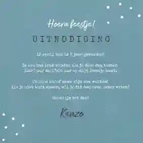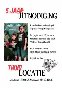 Het is soms best een opgave, bedenken wat voor kinderfeestje je wilt organiseren voor je kleine jongen of meisje. Het ene moment vinden ze het één leuk, het volgende moment iets anders. Daarom hebben we onze designers gevraagd uitnodigingen te maken voor verschillende activiteiten én in uiteenlopende stijlen. Er zit dus vast een uitnodiging tussen die je aanspreekt. Heb je een leuke uitnodiging gezien, maar is het voor een kindje van 6 jaar of 7 jaar? Controleer dan of de leeftijd van deze uitnodiging aanpasbaar is. Mocht dit niet het geval zijn, dan kun je contact opnemen met ons klanttevredenheidsteam. Onze designers gaan dan kijken of ze ‘5 jaar’ op de uitnodiging voor het kinderfeestje kunnen zetten.