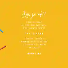Net als volwassenen zijn ook kinderen maar één keer per jaar jarig. Toch vieren de meeste kinderen het niet één, maar twee keer: op hun verjaardag en tijdens hun kinderfeestje! Gaat ook jouw - niet meer zo kleine - spruit een feestje geven voor vriendjes en vriendinnetjes? Dan biedt dat dubbel de kans om met uitnodigingen rond te gaan. Maar wees niet bang; twee aparte uitnodigingen maken is niet nodig. Bij Kaartje2go kun je namelijk heel makkelijk ontwerpen kopiëren. De uitnodiging voor het verjaardagsfeest of het kinderfeestje is dus zo aangepast.