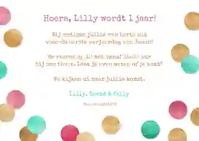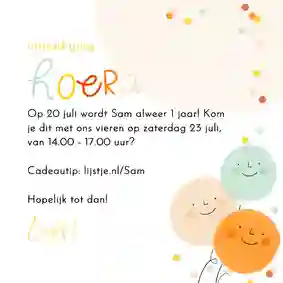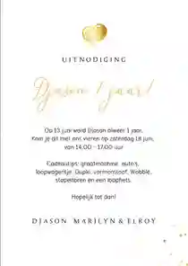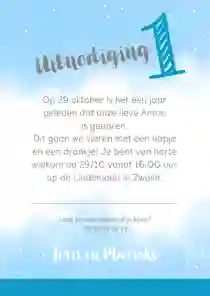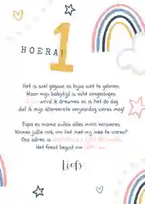 Het wordt een speciale dag want je zoontje of dochtertje krijgt een taart met één kaarsje erop. Iedereen kijkt ernaar uit. Het is niet alleen voor jou als mama of papa, maar ook voor de hele familie, een bijzondere gebeurtenis. Er worden voor het eerst verjaardagsgeschenken uitgedeeld en er komt een lekkere verjaardagstaart met een kaarsje, die je peuter waarschijnlijk met veel geklieder naar binnen zal spelen. Als je wilt dat iedereen erbij is op deze speciale verjaardag, dan kan je je vrienden en familie uitnodigen met een verjaardagskaart om deze eerste verjaardag van je kindje mee te komen vieren.