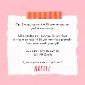 Wordt je meisje al wat ouder, bijvoorbeeld 9, 10, 11 of zelfs al 12 jaar? Dan wil ze vast en zeker helpen bij het maken van haar kinderfeestjes uitnodiging. Kruip dus gezellig samen achter de computer en bekijk de ontwerpen voor meisjes. Een leuke uitnodiging gevonden? Open het ontwerp in de kaartmaker en pas de tekst, kleuren, cijfers en andere elementen naar wens aan. Ook kun je een mooie foto aan de uitnodiging toevoegen.Tevreden met het resultaat? Laat de uitnodigingen thuis bezorgen (samen met eventuele extra’s) of stuur ze direct op naar haar vriend(innet)jes!