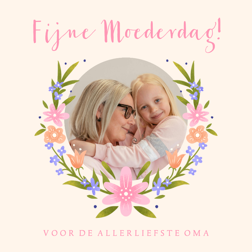 Een vrolijke moederdagkaart met illustratie van een bloemenkrans. Alle tekst en foto's zijn gemakkelijk aan te passen.