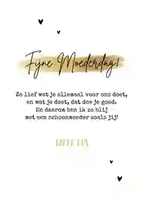 Wat heerlijk dat je een goede band met je schoonmoeder hebt. Niets geen “koude kant”. En naast dat ze een geweldige zoon of dochter heeft opgevoed, is ze misschien ook nog eens een superoma voor jullie kindje(s). Allemaal redenen om een Moederdag kaart naar je schoonmoeder te sturen.