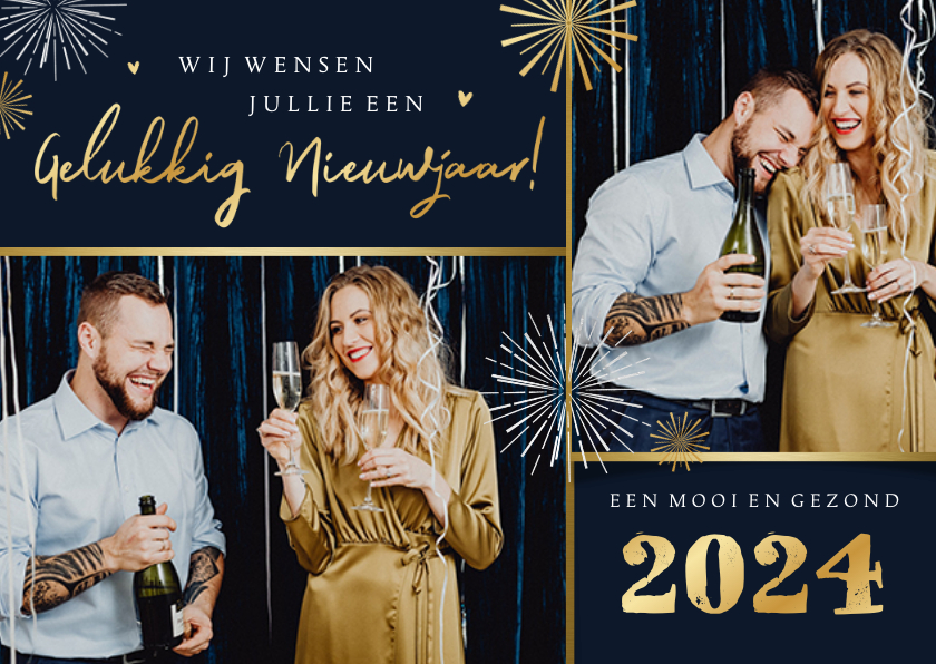 Een persoonlijk nieuwjaarskaartje met goudlook letters, vuurwerk, hartjes en eigen foto's.
