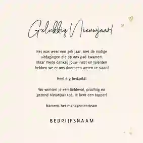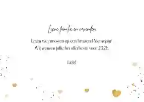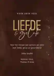 Onze kant-en-klare nieuwjaarskaarten zijn met liefde gemaakt en dat stralen ze ook uit. Is er sprake van liefde op het eerste gezicht? Duik dan in onze kaartmaker en pas de kaart naar wens aan. Schrijf bijvoorbeeld een liefdevolle nieuwjaarswens aan de binnenkant. Er gaat immers niks boven een liefdevolle nieuwjaarswens die uit je hart komt. Ook is er vaak nog wel ruimte voor een foto. Voeg dus gerust een kiekje van de persoon die jij liefhebt toe.