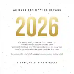 Nieuwjaarskaarten met het jaartal erop zijn elk jaar weer populair. Ze geven een voorproefje van het nieuwe jaar, en staan daardoor ook een beetje voor een nieuw begin. Onze designers hebben de mooiste nieuwjaarskaarten ontworpen met 2026 in verschillende stijlen: