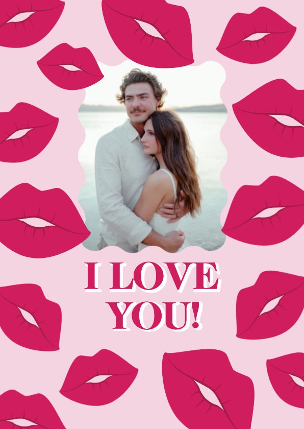 Een poster in roze en rood met foto en zoentjes met de tekst I love you.