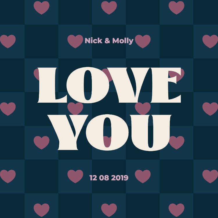 Hippe poster met een stoer patroon van donkerblauwe blokjes en roze hartjes.