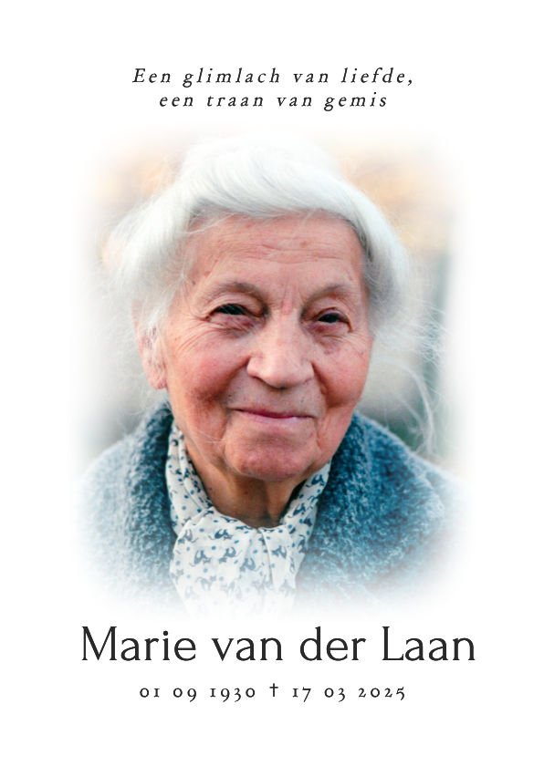 Herdenkingsposter voor bijvoorbeeld een dienst, met een mooie foto en ruimte voor de naam, data en een mooie tekst.