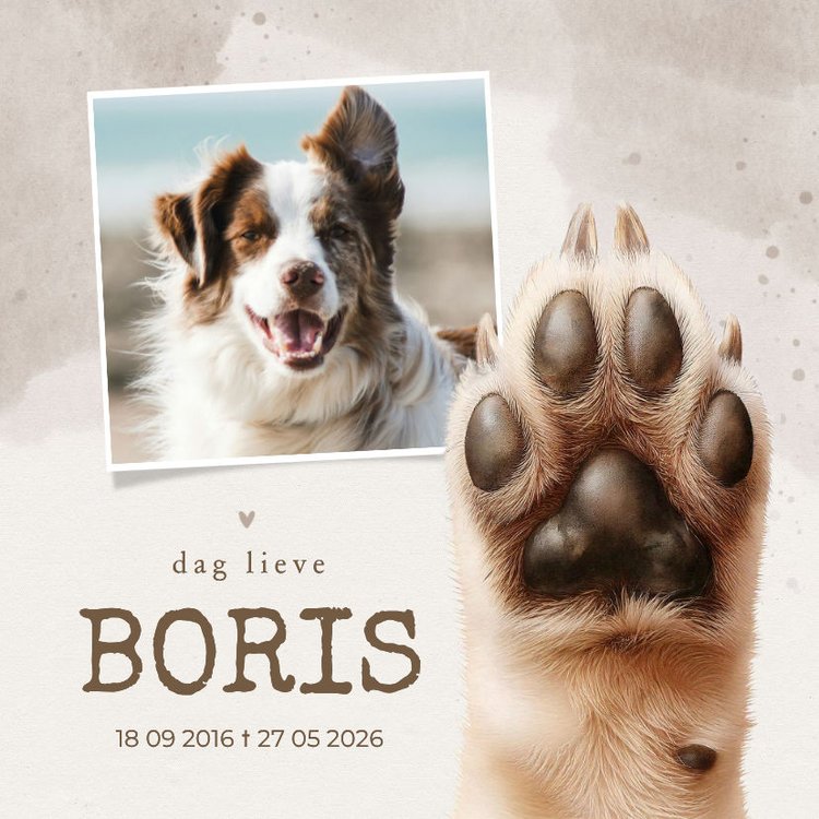 Een poster als aandenken aan jouw hond. Met naam, datums & eigen foto. Met een illustratie van een pootje.