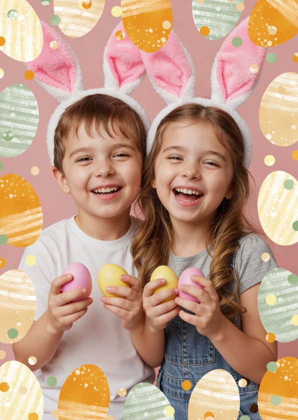 Vrolijke poster met een kader van paaseieren en een mooie persoonlijke foto op de achtergrond.