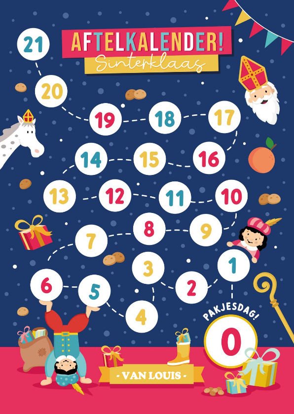 Aftel poster tot Sinterklaas pakjesdag met leuke illustraties. Van 21 naar 0, zonder datums er op.