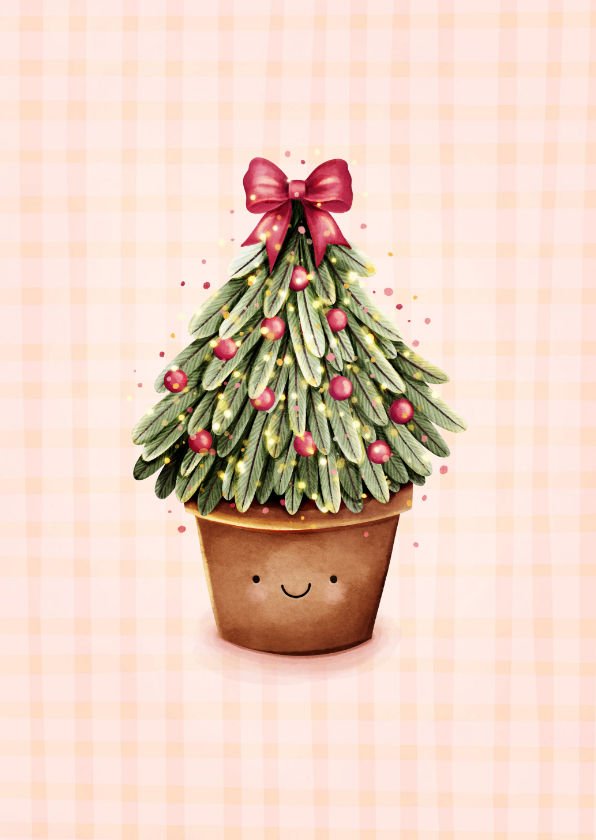 Vrolijke poster met een illustratie van een kerstboom met strik. Met een leuke ruitjes achtergrond.