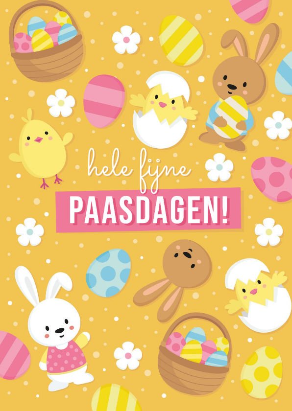 Vrolijke poster met een gele achtergrond en een patroontje van konijntjes, paaseieren, paasmandjes en kuikentjes.