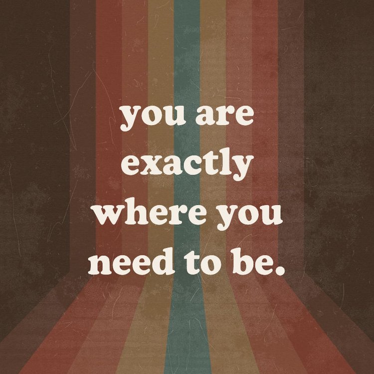 Vrolijke poster in retrothema met (aanpasbare) tekst: you are exactly where you need to be. Met regenboogkleuren op een donkere achtergrond.