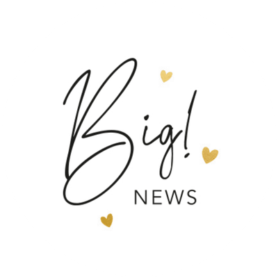 Witte sluitzegel met zwarte tekst 'Big news' en drie gouden hartjes