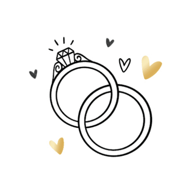 Witte sluitzegel met 2 handgetekende ringen in het zwart met gouden en zwarte hartjes eromheen.