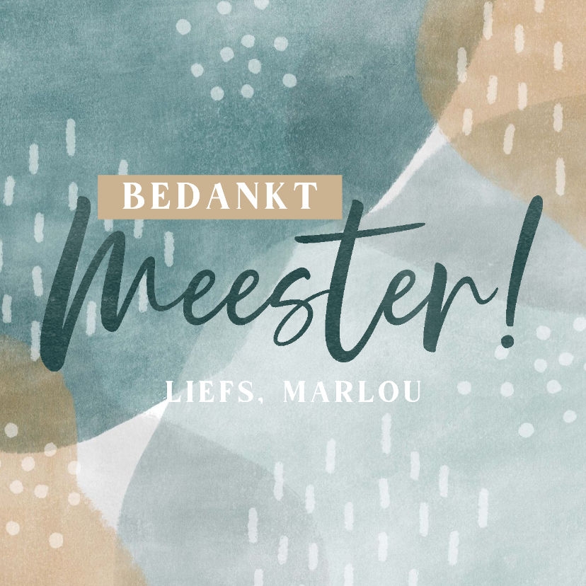 De tekst op dit tegeltje 'Bedankt meester' met de aanpasbare naam op blauwe waterverf achtergrond met beige.