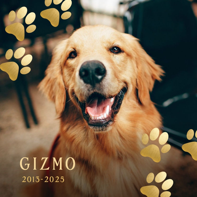 Leuk tegeltje met een grote foto van jouw eigen hond of kat erop. Met goudlook pootjes afdrukken.