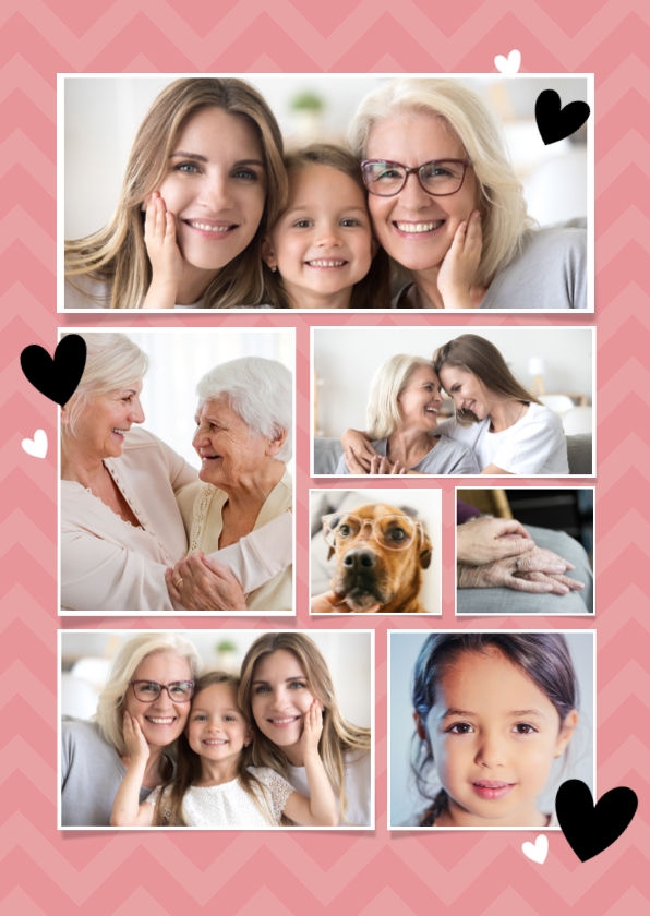 Tegeltje met 7 foto's op een roze achtergrond met zigzag motief en hartjes die je kan verplaatsen.