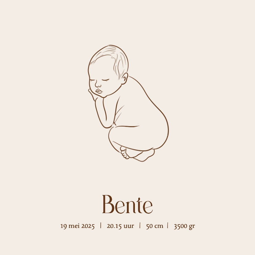 Beige geboortetegel met een illustratie van een baby. Met naam, gewicht en lengte.