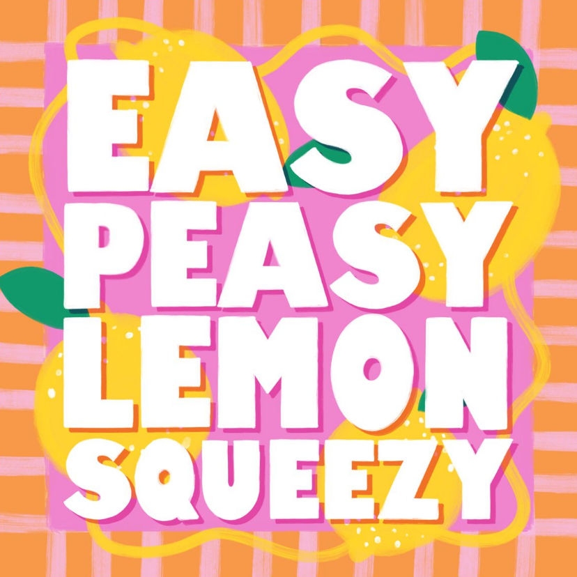 Een vrolijk, kleurrijk tegeltje voor iemand die geslaagd is met oranje, roze en gele kleuren, typografie "easy peasy lemon squeezy" en citroenen.