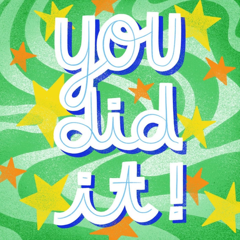 Een vrolijk tegeltje voor de geslaagde met groene, blauwe en oranje kleuren, typografie "you did it!".