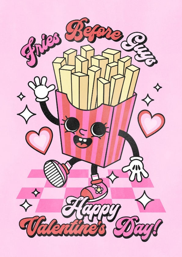 Grappig tegeltje voor Valentijnsdag, om bijvoorbeeld te sturen naar je vriendinnen. Fries before guys!