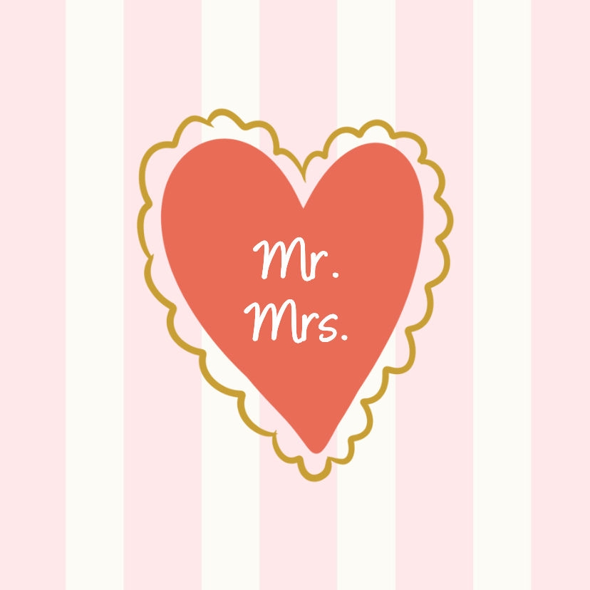 Modern en lief tegeltje voor een bruiloft. Met roze streepjes en rood hartje. Mr. and Mrs.