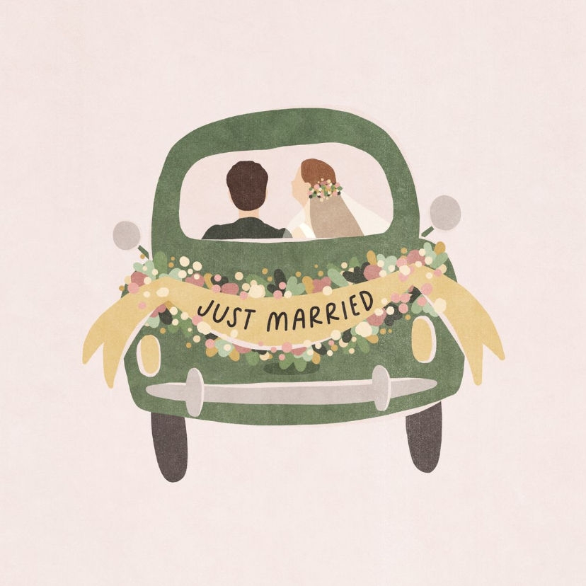 Leuk tegeltje voor een pasgetrouwd stel met een illustratie van de achterkant van een auto met een banner 'just married'.