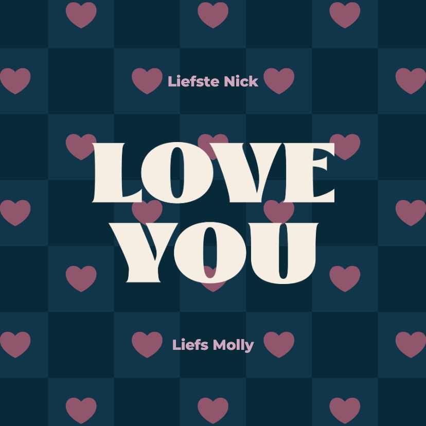 Hippe liefdesmok met een blokjespatroon met hartjes en de tekst 'Love You'