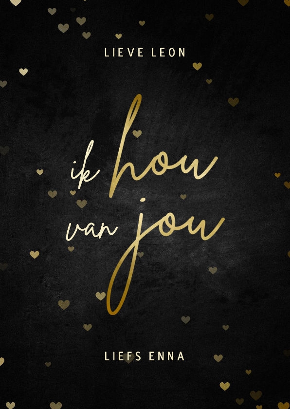 Stijlvol tegeltje in een donkere tint met gouden hartjes en de tekst: ik hou van jou.