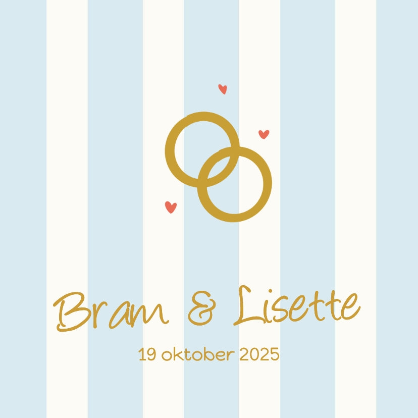 Een hippe tegel met blauwe streepjes en trouwringen. Met namen en trouwdatum. Voor een bruiloft.