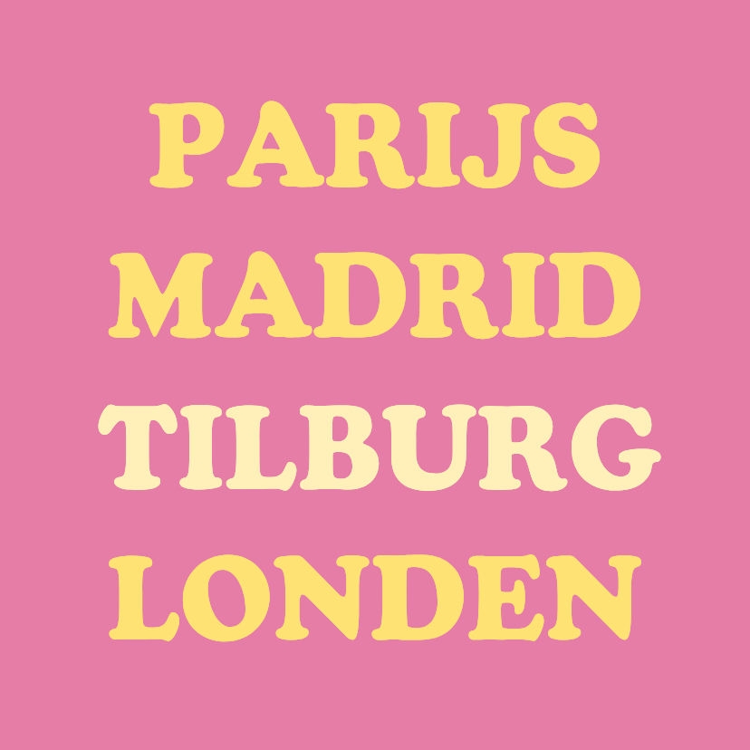 Grappig tegeltje voor in huis met 3 wereldsteden en jouw eigen plaatsnaam erop. Tekst is aanpasbaar.