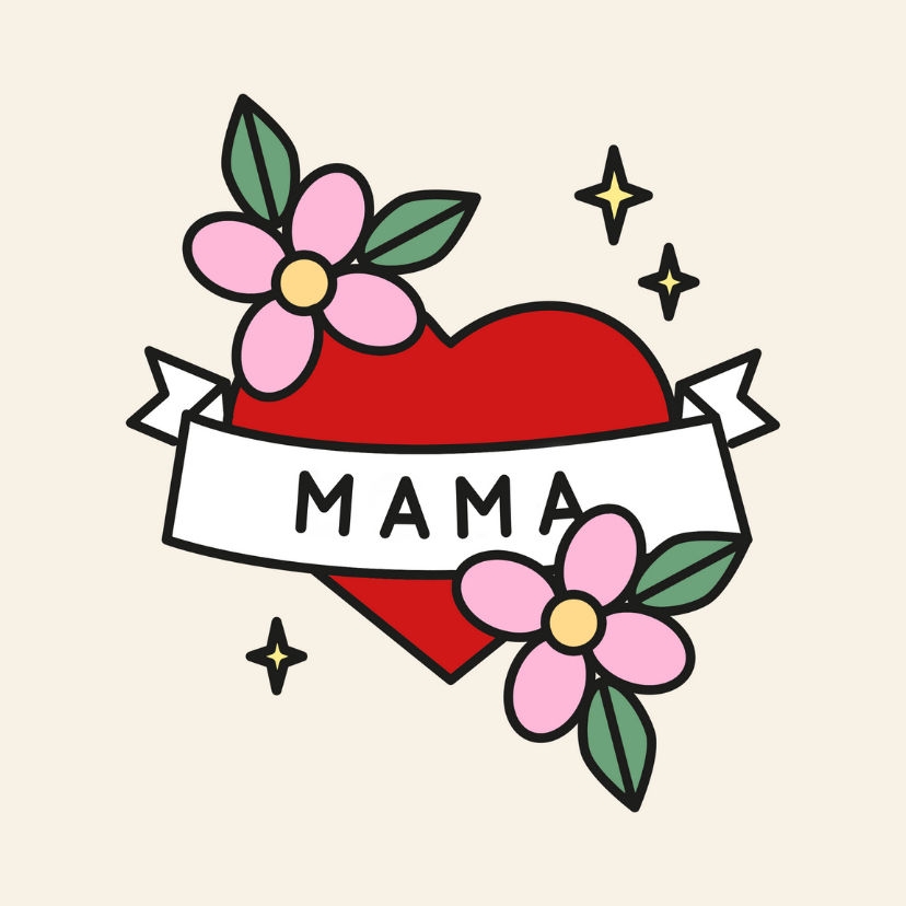 Een tegeltje voor moederdag met een tatoeage stijl hartje met bloemetjes en de tekst mama.