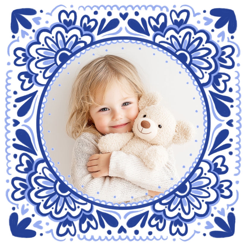 Tegeltje met een eigen foto in een cirkelvormig Delfts blauw kader in blauw wit.