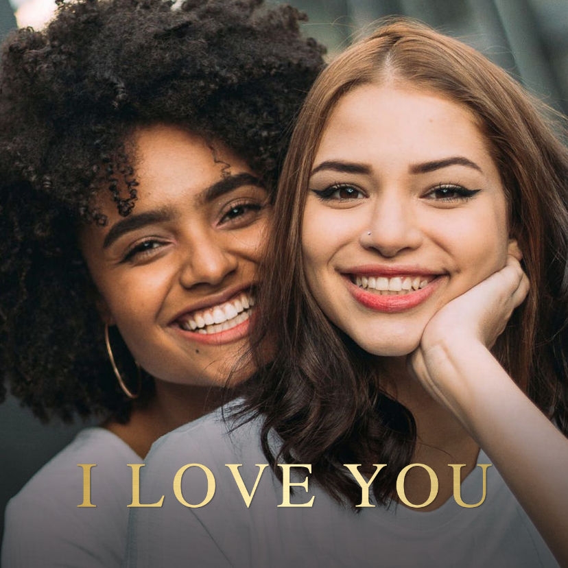Vierkante tegel met daarop een grote eigen foto. Met goudlook tekst: I love you