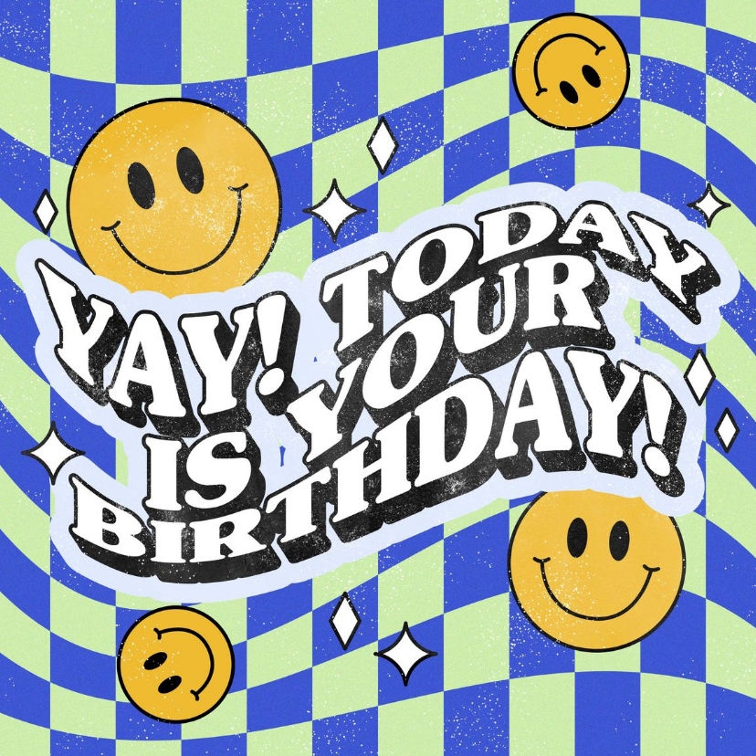 Vrolijk, hip tegeltje met goren en blauw geblokte achtergrond, typografie Yay! today is your birthday!, smiley's en sterretjes