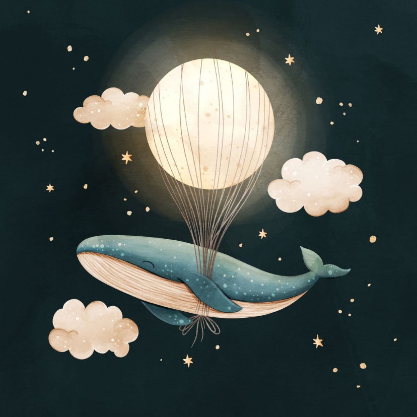 Lief tegeltje met een blauwe waterverf achtergrond en een illustratie van een walvis met een luchtballon maan, wolken en sterren.
