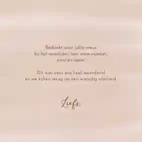Het kan lastig zijn de juiste woorden te vinden voor het bedankkaartje. Met het volgende voorbeeld kun je het bedankkaartje na het overlijden heel persoonlijk maken.
