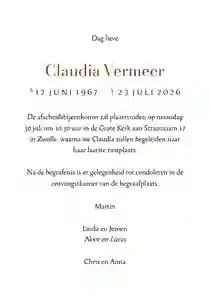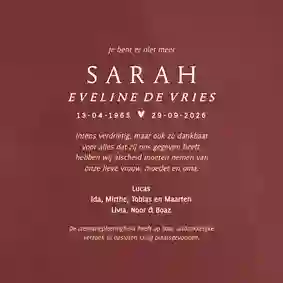 Helemaal zelf een rouwkaart met bloemen ontwerpen is best een opgave. Daarom hebben onze ontwerpers bloemen rouwkaarten gemaakt die je gemakkelijk aanpast. Zo is het mogelijk om foto’s toe te voegen, elementen te verplaatsen (of verwijderen) en kleuren aan te passen. Ook het lettertype kan naar wens gewijzigd worden. Loop je tijdens het bewerken van de bloemen rouwkaart ergens tegenaan? Neem dan gerust contact met ons op. Ons team helpt je graag verder.