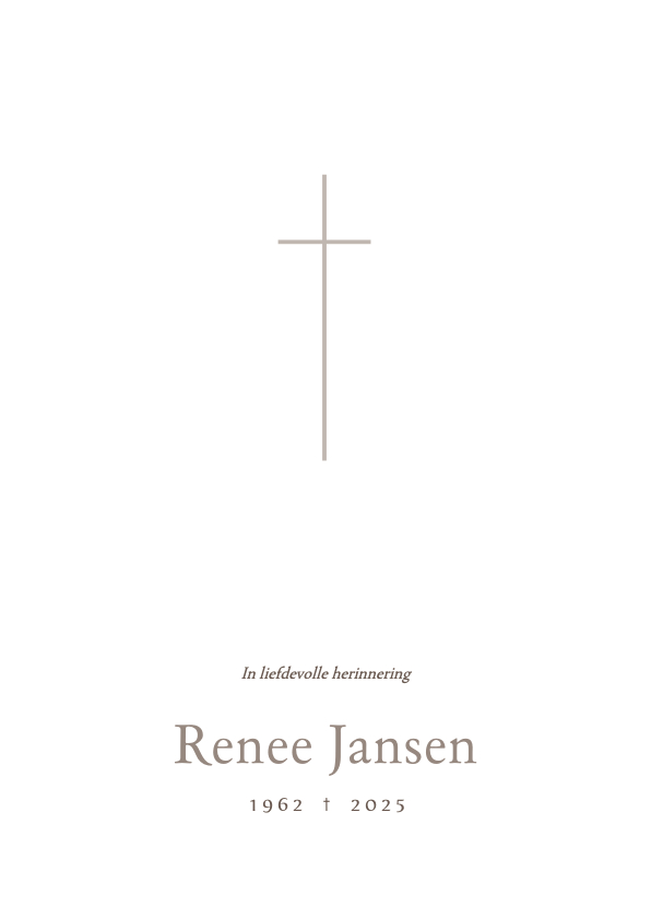 Een minimalistische witte rouwkaart met een subtiel kruisje. De typografie is klassiek.