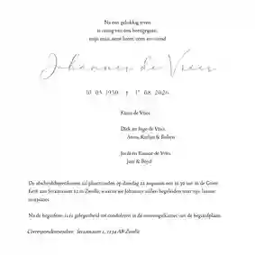 Een foto voor de rouwkaart van een dierbare uitkiezen kan lastig zijn. Je wilt de overledene natuurlijk recht doen en deze persoon goed portretteren. Weet je niet direct welke foto op de rouwkaart past, maar wil je er wel graag een foto op plaatsen? Dan kan het helpen om fotoalbums of -mappen van belangrijke gebeurtenissen door te bladeren, bijvoorbeeld van bruiloften, vakanties of verjaardagen. Ook kun je andere nabestaanden om hulp vragen. Misschien heeft iemand anders nog wel een mooie foto van de overledene liggen.