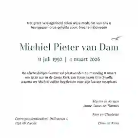 Een rouwkaart met een foto maken is een mooie manier om een overleden dierbare te herdenken en te laten zien hoe deze persoon was. Wil je ook je dierbare afbeelden op zijn of haar rouwkaart? In onze collectie vind je rouwkaarten met foto(‘s) in uiteenlopende stijlen, kleuren en thema’s.