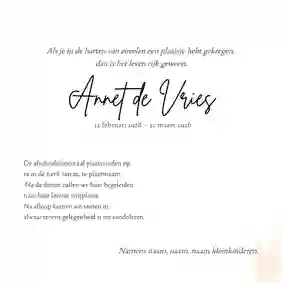 Een foto voor de rouwkaart van een dierbare uitkiezen kan lastig zijn. Je wilt de overledene natuurlijk recht doen en deze persoon goed portretteren. Weet je niet direct welke foto op de rouwkaart past, maar wil je er wel graag een foto op plaatsen? Dan kan het helpen om fotoalbums of -mappen van belangrijke gebeurtenissen door te bladeren, bijvoorbeeld van bruiloften, vakanties of verjaardagen. Ook kun je andere nabestaanden om hulp vragen. Misschien heeft iemand anders nog wel een mooie foto van de overledene liggen.