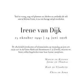 Zacht, kalm en voldaan, omringd door ZIJN/HAAR geliefden is van ons weggegleden MIJN/ONZE [NAAM DIERBARE]