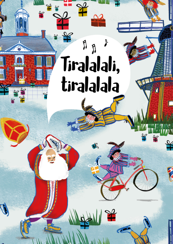 Sinterklaaskaart met schaatsende Sint en pietjes. Schrijf jouw gedicht op deze kaart!