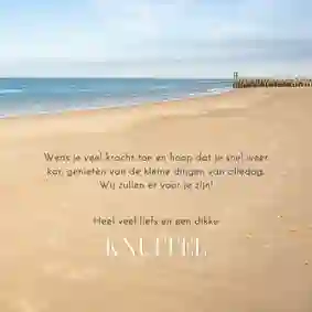 Het schrijven van een sterkte kaart kan best lastig zijn. Daarom vind je in veel van onze kaarten voorbeeldteksten die je kunt aanpassen, zodat ze goed aansluiten op jouw situatie. Daarnaast hebben we de volgende tips, mocht je zelf graag een bemoedigende boodschap willen schrijven:
