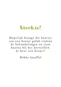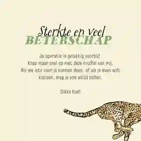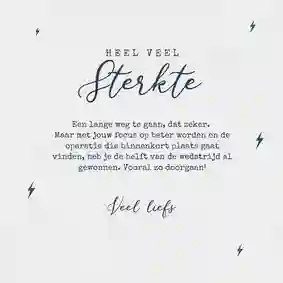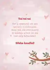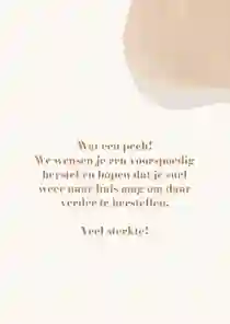 In onze collectie vind je voor ieder type operatie een passende succes kaart. Is een dierbare ernstig ziek of moet iemand een levensreddende operatie ondergaan? Kies dan voor een rustig ontwerp met een mooie tekst. Gaat het om een kleine ingreep? Dan kan een grappige kaart met ‘Stay pawsitive’ of ‘Zet je beste beentje voor’ juist voor een glimlach zorgen. Vind je het toch moeilijk om de juiste woorden te vinden? Bedenk dan dat het allerbelangrijkste is dat de boodschap vanuit je hart komt.