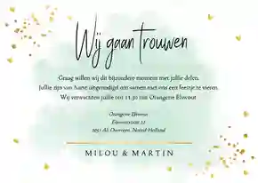 Groen en goud vullen elkaar prachtig aan. Kijk maar eens tussen onze groene trouwkaarten met gouden foliedruk. De glimmende letters en elementen vallen direct op en worden in evenwicht gehouden door het natuurlijke groen. Ook de afwisseling met zwart en wit laat de trouwkaart rustig ogen. Stop de trouwkaart als finishing touch in een gouden envelop en plak er een sluitzegel met gouden hartjes op.